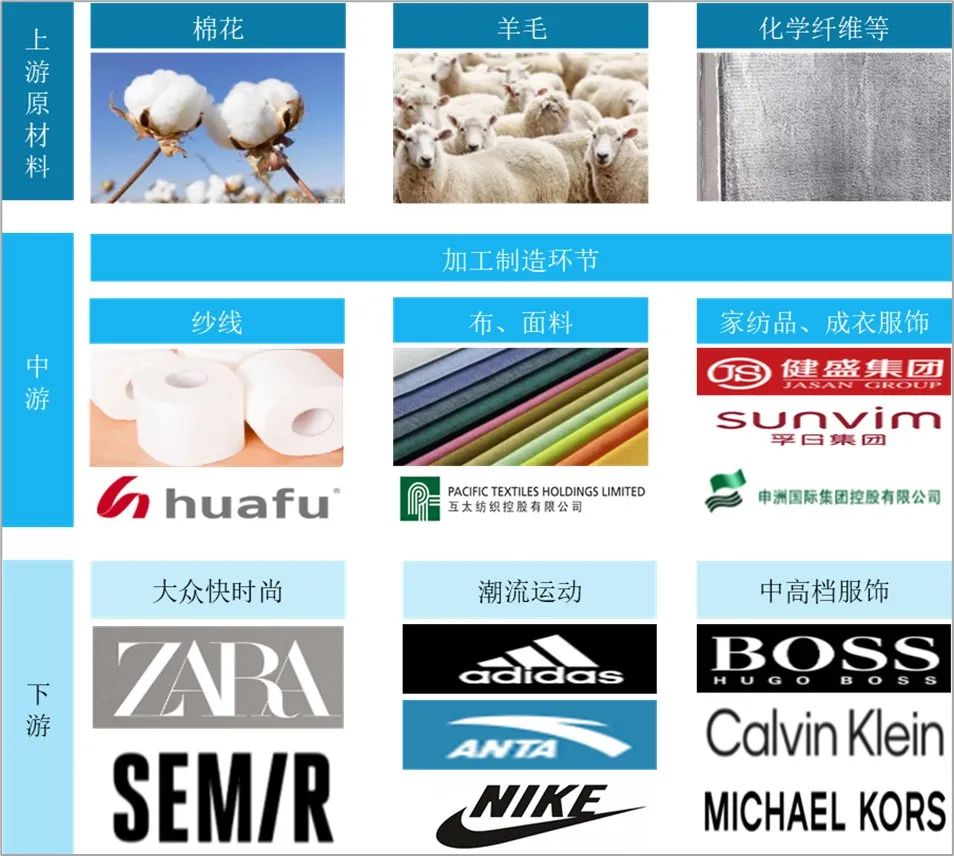 紡織業(yè)的上游原材料包括棉花、羊毛、化學纖維等,中游是紡織行業(yè)的加工及制造環(huán)節(jié),下游產業(yè)主要有服裝業(yè)、家用紡織品、產業(yè)用紡織品等。