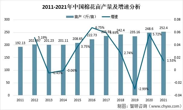 2021年,受種植效益和種植結構調整等因素影響,種植面積降幅較大,帶動中國整體棉花種植面積及產量下降。全國棉花總產量573萬噸,比2020年減少18萬噸,下降3.05%。