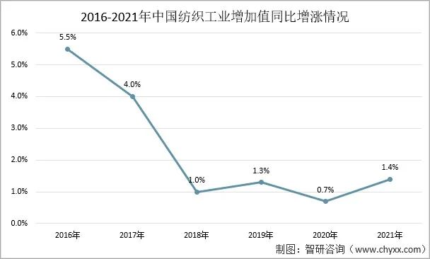 從紡織工業(yè)增加值來看,2016年-2021年中國紡織工業(yè)在穩(wěn)定增漲。2021年中國紡織工業(yè)增加值同比增漲1.4%。
