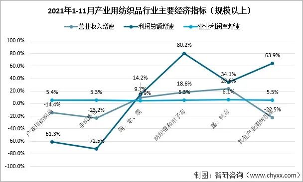 2021年1-11月產業(yè)用紡織品行業(yè)規(guī)模以上企業(yè)的營業(yè)收入同比下降14.4%,利潤總額同比下降61.3%,營業(yè)利潤率為5.4%。非織造布行業(yè)的營業(yè)收入和利潤總額分別同比下降23.2%和72.5%,營業(yè)利潤率為5.3%。繩、索、纜行業(yè)的營業(yè)收入和利潤總額分別同比增長9.7%和14.2%,營業(yè)利潤率為4.9%。紡織帶和簾子布市場延續(xù)了良好的發(fā)展勢頭,營業(yè)收入和利潤總額分別同比增長18.6%和80.2%,營業(yè)利潤率達到5.3%。篷、帆布的營業(yè)收入和利潤總額分別同比增長23.6%和34.1%,6.1%的營業(yè)利潤率為行業(yè)最高。醫(yī)療衛(wèi)生、過濾、土工用紡織品所在的其他產業(yè)用紡織品的營業(yè)收入和利潤總額分別同比下降22.5%和63.9%,營業(yè)利潤率為5.5%。