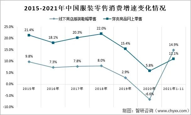 根據國家統(tǒng)計局數據,1~11月,實體商店服裝鞋帽類商品零售總額同比增長14.9%,穿類商品網上零售額增長11.1%,雖然國內消費市場受疫情多點散發(fā)等因素影響,11月當月服裝商品零售額略有下降,降幅環(huán)比收窄,但實體與網絡服裝零售兩年平均增速持續(xù)較快增長,國內消費整體的復蘇態(tài)勢并未變化。
