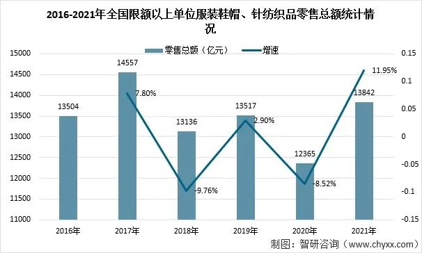 2021年全國限額以上單位服裝鞋帽、針紡織品零售總額為13842億元,同比增漲了11.95%。