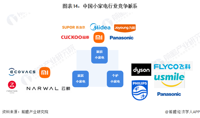 根據各市場主體主營產品的類型差異,中國小家電行業可以劃分為三個競爭派系。廚房小家電領域的主要參與者有美的集團、蘇泊爾、九陽股份、松下電器等;家居小家電產品主要包括掃地機器人、洗地機、無線吸塵器等產品,參與者包括科沃斯、石頭科技、小米科技、云鯨等品牌;個護小家電產品主要包括電吹風、電動剃須刀、電動牙刷等產品,市場參與者包括戴森、飛利浦、飛科電器、松下電器、USMILE等。