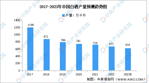 在消費(fèi)市場環(huán)境變化、年輕消費(fèi)者口味變化、限制“三公”消費(fèi)、“禁酒令”等多方面因素的影響下,我國白酒產(chǎn)量逐年下降。2022年,全國白酒累計產(chǎn)量671萬千升,同比下滑5.6%。這是2017年以來全國白酒產(chǎn)量連續(xù)第六年下跌。預(yù)計2023年我國白酒產(chǎn)量616萬千升。