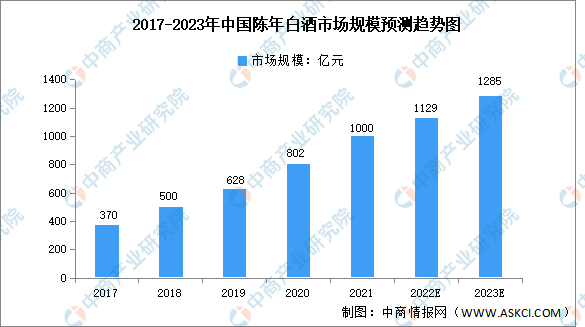 陳年白酒是由具備白酒生產(chǎn)資質(zhì)企業(yè)以傳統(tǒng)白酒工藝釀造,出廠10年以上,且保存完好的白酒產(chǎn)品。近年來,茅臺酒、五糧液、汾酒、瀘州老窖特曲等品牌的陳年酒市場規(guī)模高速增長,由2017年的370億元增長至2021年的1000億元,復(fù)合年均增長率達(dá)28.2%。未來,隨著國民消費(fèi)水平進(jìn)一步提高,預(yù)計2023年我國陳年白酒市場規(guī)模將達(dá)1285億元。