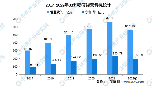五糧液主要產(chǎn)品“五糧液酒”是我國濃香型白酒的典型代表。同時,五糧液根據(jù)生產(chǎn)工藝特點(diǎn)開發(fā)了五糧春、五糧醇、五糧特曲、尖莊等品類齊全、層次清晰的系列酒產(chǎn)品。2021年,五糧液營業(yè)收入達(dá)662.09億元,凈利潤實(shí)現(xiàn)233.77億元。2022年前三季度實(shí)現(xiàn)營業(yè)收入557.79億元,凈利潤199.89億元。