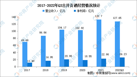 古井貢酒是中國老八大名酒企業(yè),是中國第一家同時發(fā)行A、B兩支股票的白酒類上市公司,坐落在世界十大烈酒產(chǎn)區(qū)之一的安徽省亳州市。2021年,古井貢酒營業(yè)收入達(dá)132.7億元,實(shí)現(xiàn)凈利潤22.98億元。2022年前三季度實(shí)現(xiàn)營業(yè)收入127.65億元,凈利潤26.23億元。