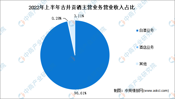 從主營業(yè)務(wù)來看,2021年古井貢酒主營白酒業(yè)務(wù)、酒店業(yè)務(wù),營業(yè)收入占比分別為96.61%、0.28%。