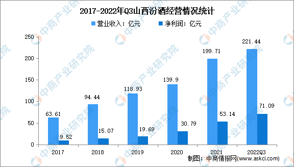 山西汾酒的主要產(chǎn)品汾酒是我國清香型白酒的典型代表,竹葉青酒是著名的保健養(yǎng)生酒,在國內(nèi)外享譽(yù)盛名。山西汾酒2021年實(shí)現(xiàn)營業(yè)收入199.71億元,凈利潤53.14億元。2022年前三季度實(shí)現(xiàn)營業(yè)收入221.44億元,實(shí)現(xiàn)凈利潤71.09億元。