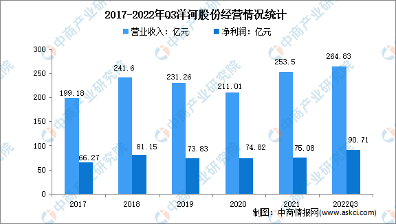 洋河股份是全國大型白酒生產(chǎn)企業(yè),是白酒行業(yè)唯一擁有洋河、雙溝兩大中國名酒,兩個中華老字號,六枚中國馳名商標(biāo)的企業(yè)。洋河股份主導(dǎo)產(chǎn)品夢之藍(lán)、天之藍(lán)、海之藍(lán)、蘇酒、珍寶坊、洋河大曲、雙溝大曲等系列白酒,在全國享有較高的品牌知名度和美譽(yù)度。2021年,洋河股份營業(yè)收入達(dá)253.5億元,凈利潤達(dá)75.08億元。2022年前三季度,洋河股份實(shí)現(xiàn)營業(yè)收入264.83億元,凈利潤達(dá)90.71億元。