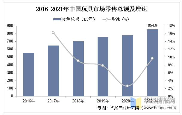 2016-2021年中國玩具市場(chǎng)零售總額及增速