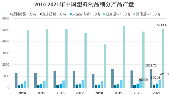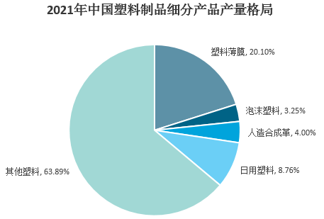 國內塑料制品產品門類眾多,從細分市場來看,2021年我國塑料薄膜產量1608.71萬噸,占比20.1%;日用塑料產量701.53萬噸,占比8.76%;人造合成革產量320.16萬噸,占比4%;泡沫塑料產量260.09萬噸,占比3.25%;其它塑料產量5113.49萬噸,占63.89%。