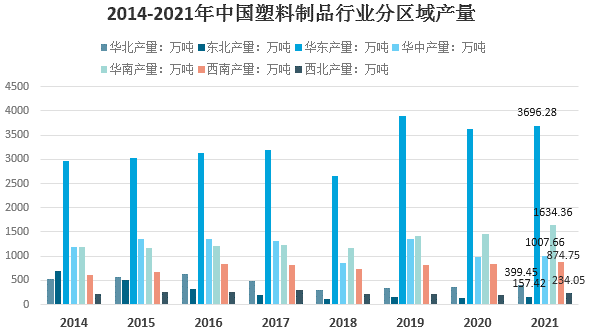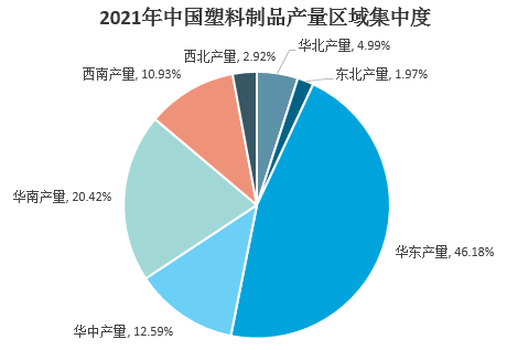 從生產的區(qū)域分布來看,國內塑料制品生產集中在華東、華南、華中地區(qū)。2021年,華東地區(qū)塑料制品產量3696.28萬噸,占全國的比重為46.18%。華南地區(qū)發(fā)展迅速,塑料制品產量1634.36萬噸,占比20.42%。華中地區(qū)塑料制品產量1007.66萬噸,占比12.59%。其他地區(qū)塑料制品產量均在千萬噸以下,其他地區(qū)合計占比20.81%。