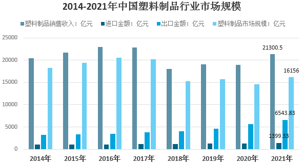 受益于上游原材料價格上漲,國內塑料制品市場止跌回暖。2021年我國塑料制品生產企業(yè)營業(yè)收入約21300.5億元,營業(yè)收入同比增長12.76%。2021年我國塑料制品行業(yè)市場規(guī)模約16156億元,市場同比增長10.7%。