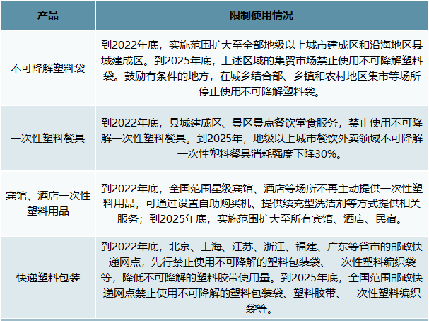 國家發(fā)展改革委、生態(tài)環(huán)境部印發(fā)《關于進一步加強塑料污染治理的意見》,明確提出了進一步加強塑料污染治理的“時間表”:2020年率先在部分地區(qū)、領域禁限生產、銷售和使用部分塑料制品。2022年一次性塑料制品消費量明顯減少,替代產品得到推廣。2025年塑料制品全環(huán)節(jié)管理制度建立,塑料污染得到有效控制。做好塑料污染治理,全國各省在展開協(xié)同作戰(zhàn),陸續(xù)推出的限塑禁塑時表。