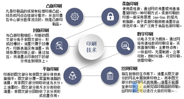 印刷是包裝的前道工序,目前的印刷技術主要分為柔版印刷、凸版印刷、凹版印刷、平版印刷、絲網印刷、數字印刷六大類。