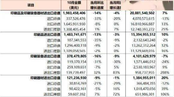 在2022年1-10月國內(nèi)印刷品、印刷裝備、印刷器材進出口總值為208.82億美元,與去年同期相比增長7%。其中,進口40.71億美元、出口168.11億美元。國內(nèi)印刷品、印刷裝備和印刷器材進出口貿(mào)易順差合計127.40億美元。