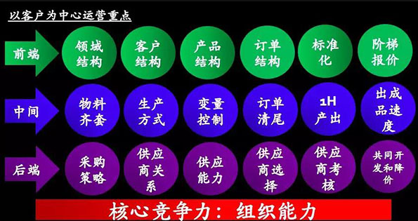 3、運營重點:企業的商業模式不一樣,對企業內部運營的要求和重點也不一樣,例如某中小型企業是以客戶為中心的,該企業的運營重點總結如下圖所示(企業階段、規模、行業等存在差異,運營重點也會有差異):